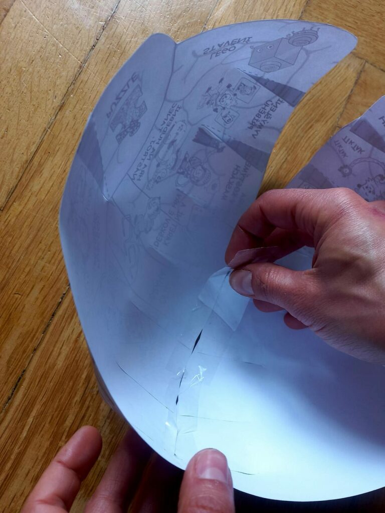 6. Aby se tyto dvě poloviny spojily, otočte je a pracujte na vnitřním švu. Začněte na jednom konci a srovnejte strany. Zajistěte páskou. Postupujte podél vnitřního švu, centimetr po centimetru, srovnávejte a lepte každou malou sekci postupně. Když se dostanete k poslední části švu, klobouk konečně nabude svého konečného tvaru.