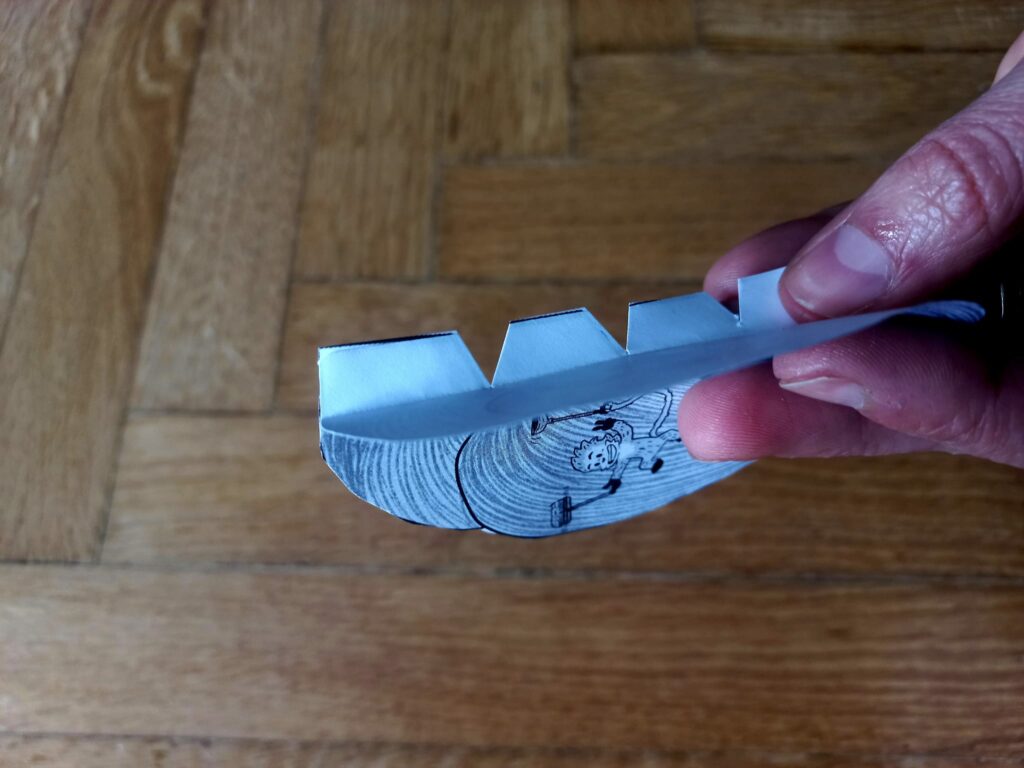 4. Zatáhněte postupně všechny “chlopně”, které jste vytvořili tak, že plná čára je nyní na čárkované čáře (a plocha s malými šipkami je přilepená zespodu). Můžete zajistit lepící páskou.